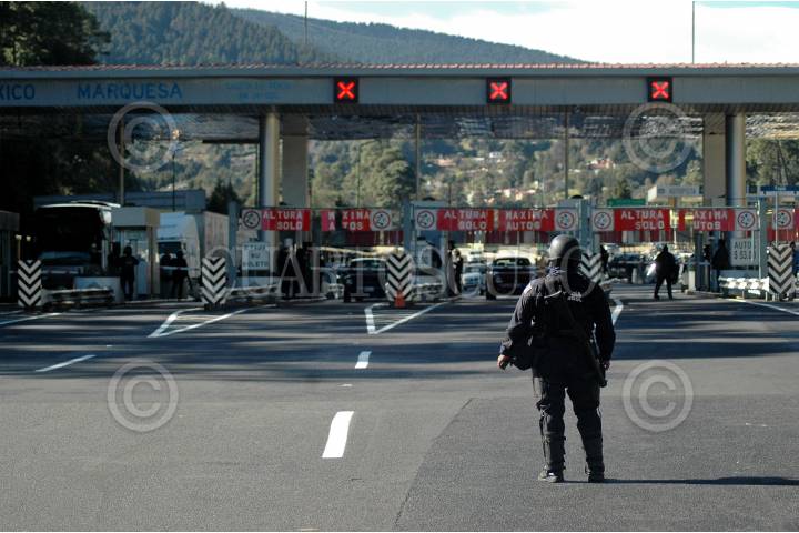MÉXICO, D.F., 04DICIEMBRE2009.- Elementos de la Policía Federal resguardaron la caseta de cobro de México - La Marqueza debido a que simpatizantes y miembros del Sindicato Mexicano de Electricistas llegaron procedentes de Toluca y Michoacan con destino al Monumento a la Revolución como parte de las acciones de resistencia que realizan para exigir la derogación del decreto de extinción de Luz y Fuerza del Centro. FOTO: RODOLFO ANGULO/CUARTOSCURO.COM
