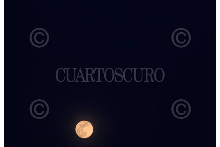 CUERNAVACA, MORELOS, 16JUNIO2019. La luna llena de este mes lució un color rosado al salir por oriente. En el extremo derecho del satélite se observa un pequeño punto, es el planeta Júpiter. FOTO: MARGARITO PÉREZ RETANA /CUARTOSCURO.COM