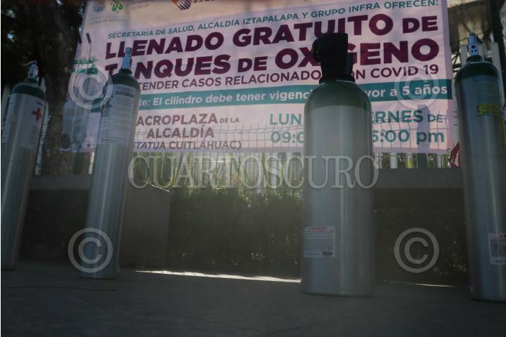 Capitalinos asistieron a abastecerse de oxígeno gratuito en la explanada de la alcaldía Iztapalapa, el cual se ofrece de lunes a viernes de 9 a 17 horas