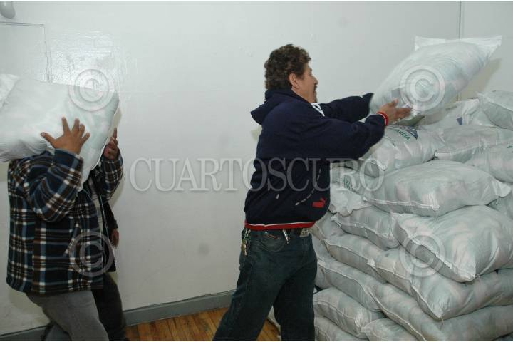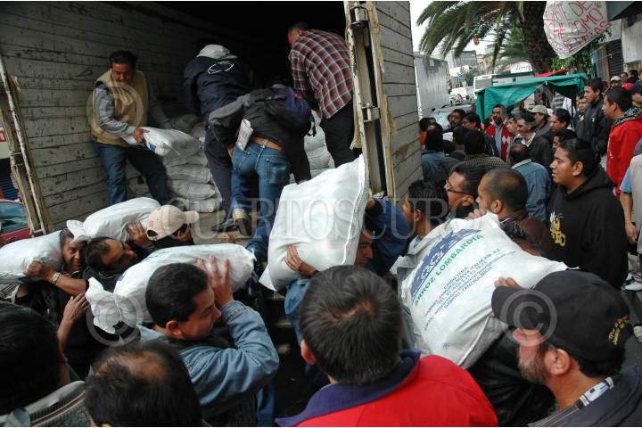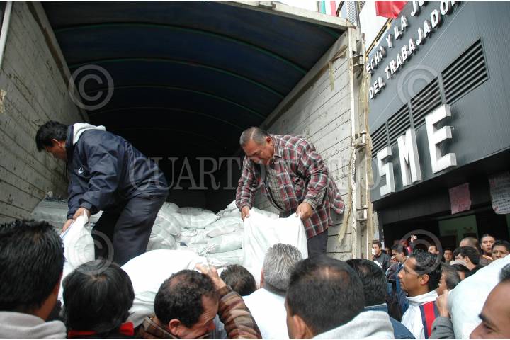 MÉXICO, D.F., 04NOVIEMBRE2009.- Integrantes de la Asociación Nacional de Empresas Comercializadores de Productores del Campo (ANEC) llevaron un donativo de arroz para los trabajadores del Sindicato Mexicano de Electricistas (SME). FOTO: RODOLFO ANGULO/CUARTOSCURO.COM