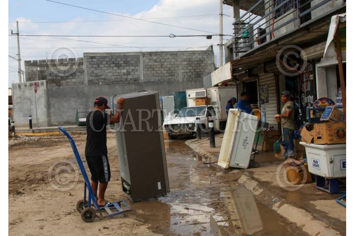 MONTERREY, NUEVO LEÓN, 11JUNIO2025.- Un hombre traslada un refrigerador fuera de su local, debido a las intensas lluvias que se registraron al poniente de la ciudad esta tarde; diversos artefactos de los vecinos de la colonia La Alianza fueron afectadas. FOTO: GABRIELA PÉREZ MONTIEL / CAURTOSCURO.COM