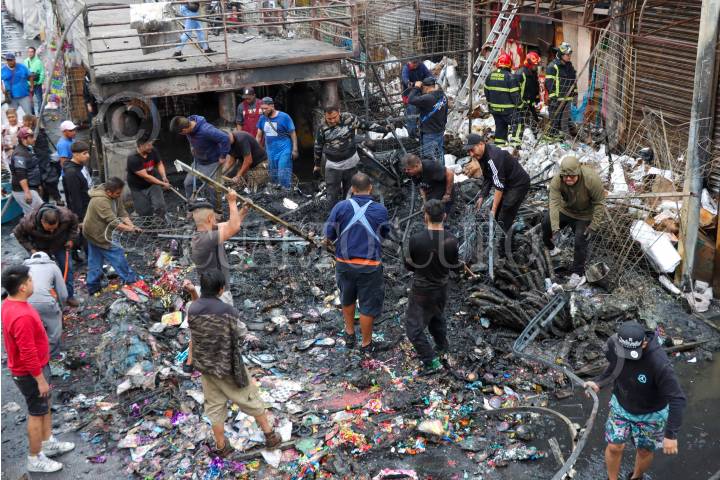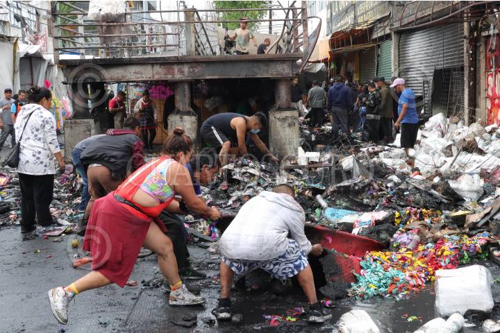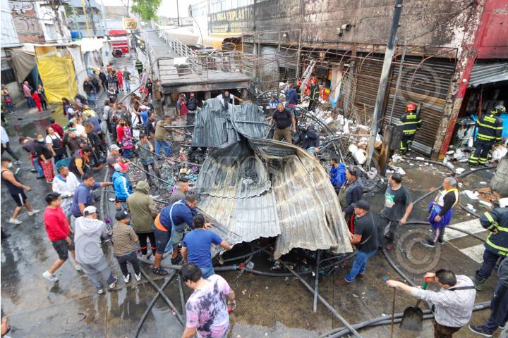 CIUDAD DE MÉXICO, 20JUNIO2024.- Bomberos y comerciantes realizaron trabajos de limpieza en la zona donde se registró un incendio en la Merced. Los hechos ocurrieron Aspectos en la calle de Cuamatzin y Rosario en la Merced, varios locales y puestos ambulantes fueron los afectados. FOTO: ROGELIO MORALES/CUARTOSCURO.COM