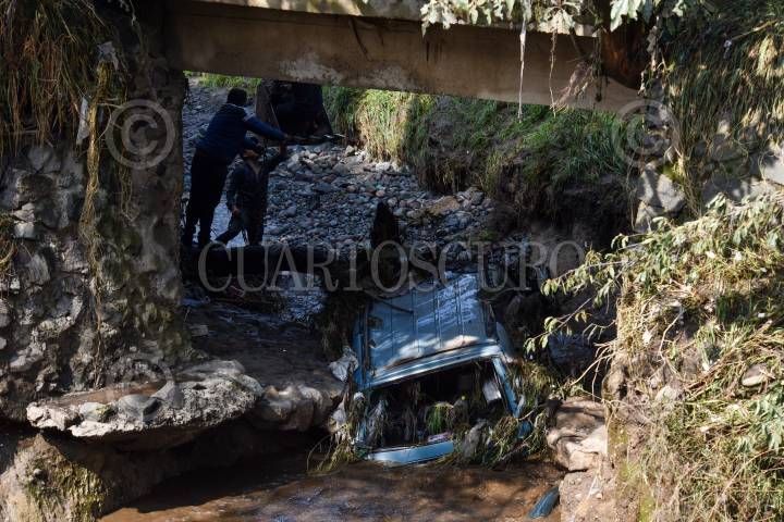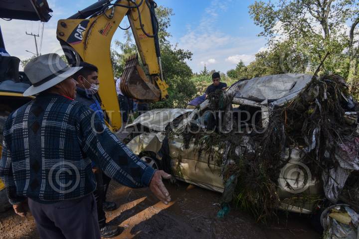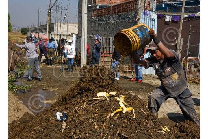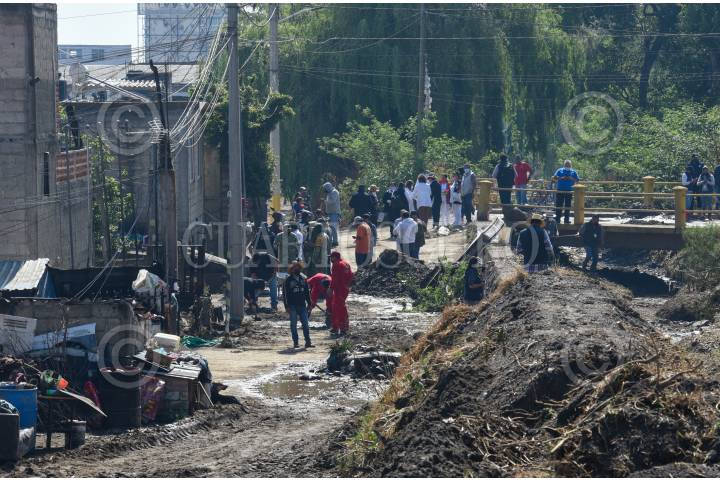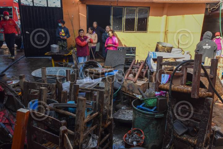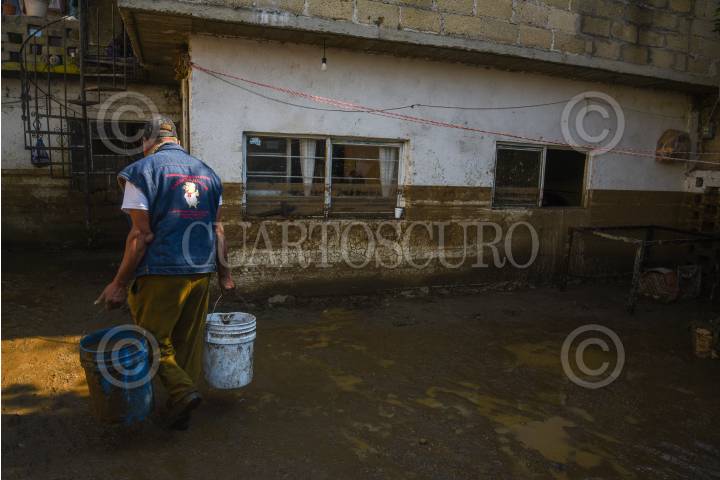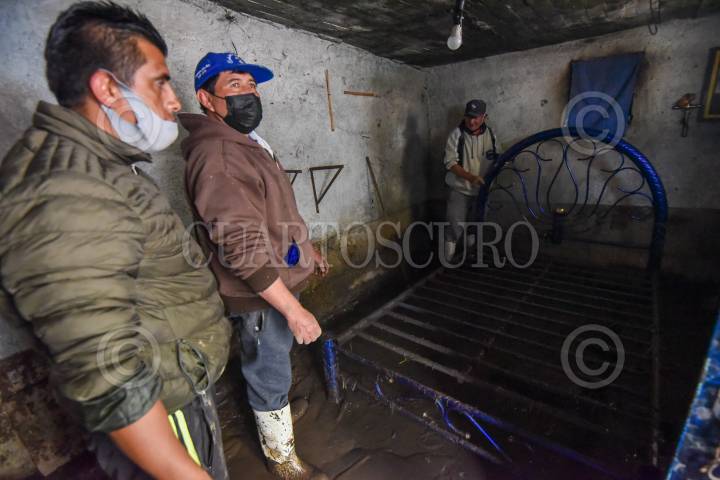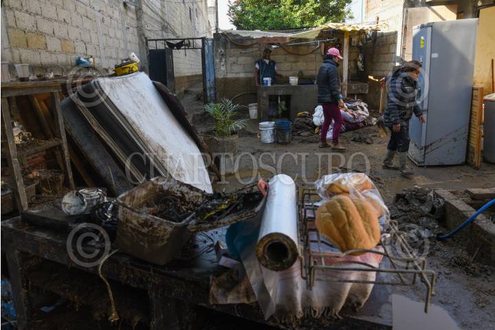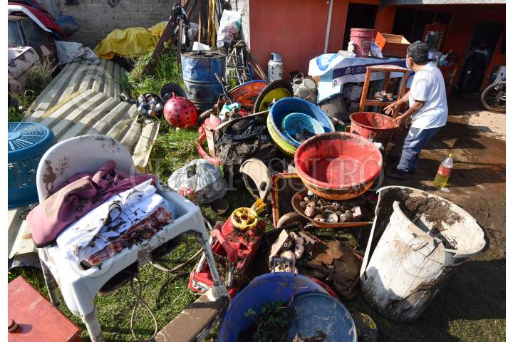 Familias de San Antonio Acahualco afectadas por el desbordamiento del río Xinantécatl realizaron trabajos de limpieza en sus hogares tratando de rescatar algunas de sus pertenencias.