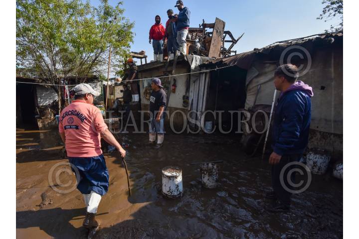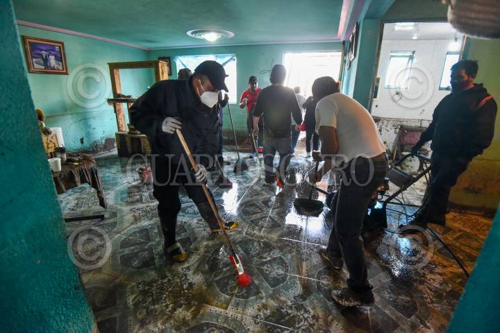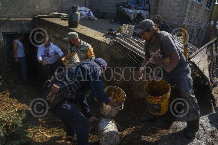 Vecinos del barrio de Masachulco en el municipio de Mexicaltzingo realizan labores de limpieza en al menos 10 viviendas después de verse afectados por el desbordamiento del río Jaral después de las lluvias registradas en el Valle de Toluca.