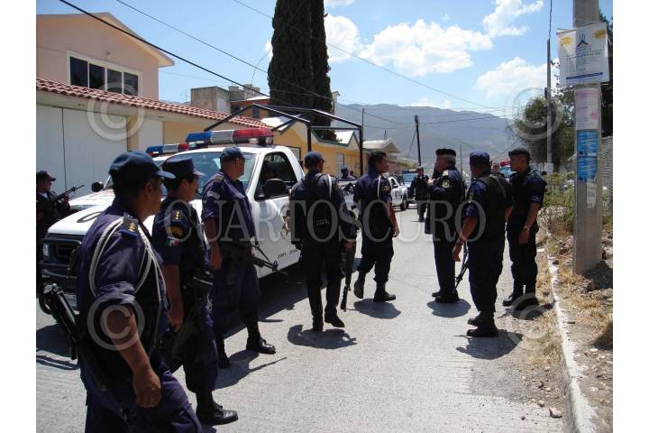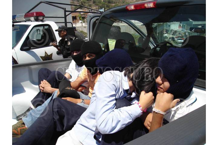 CHILPANCINGO,GUERRERO20ABRIL2007.- Elementos de diversas corporaciones como la policia preventiva municipal, policia del estado y policia investigadora ministerial (PIM) realizaron un intenso operativo desplegando varias unidades por toda la ciudad capital, luego de recibir el reporte de que cuatro sujetos armados y encapuchados se desplazaban en una camioneta Silverado de color blanco desde dode lanzaban amenazas a las personas, logrando su detencion sobre el acceso principal a la colonia Guerrero 200, resultando cuatro jovenes estudiantes del Colegion de Bachilleres y una jovencita estudiante de un colegio particular, los cuales portaban pasamontañas y gorras con insignias de la Policia Investigadora Ministerial (PIM) siendo trasladados a las instalaciones de la Procuraduria General de Justicia del Estado (PGJE). FOTO OSCAR ALVARADO/CUARTOSCURO.COM