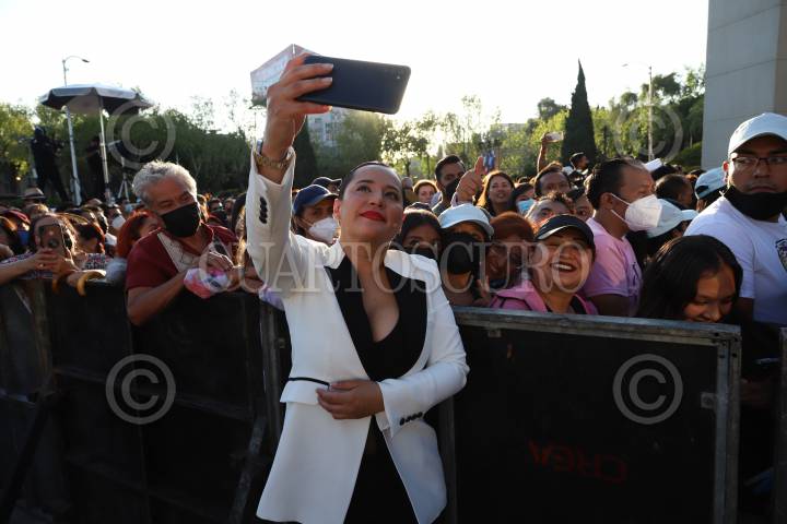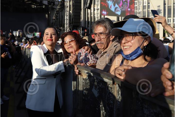 La alcaldesa Sandra Cuevas se toma fotos con los asistentes al concierto de la agrupación Los Ángeles Azules por el día de las madres en la explanada de la alcaldía Cuauhtémoc.