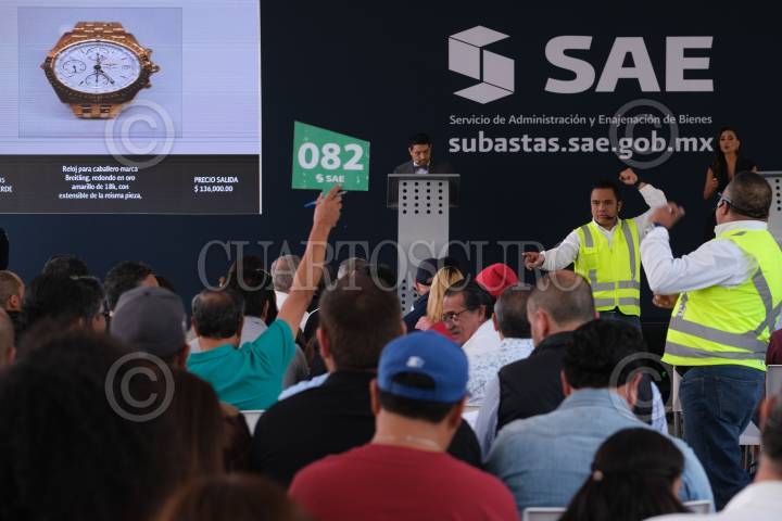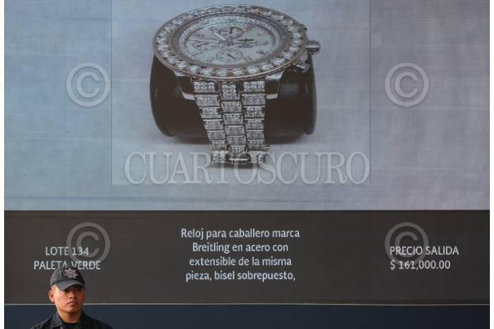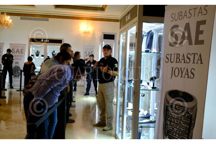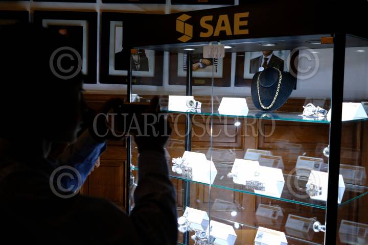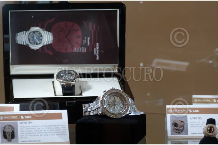 CIUDAD DE MÉXICO, 28JULIO2019.- Capitalinos visitaron la exhibición de los 153 lotes de joyas que el Servicio de Administración y Enajenación de Bienes (SAE) encabezó para la subasta ésta tarde en el Centro Cultural Los Pinos. El lote que más caro se vendió fue el reloj para caballero marca Petek Phillippe Geneve en oro blanco de 18 kilates edición limitada, cuadrado con carátula gris y extensible en la piel, el cual se subastó en 843 mil 800 pesos y fue vendido por un millón 20 mil pesos. El SAE publicó los lotes que fueron ofertados y que fueron decomisados por la Fiscalía General de la República (FGR) a integrantes de la delincuencia organizada. FOTO: GRACIELA LÓPEZ /CUARTOSCURO.COM