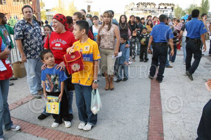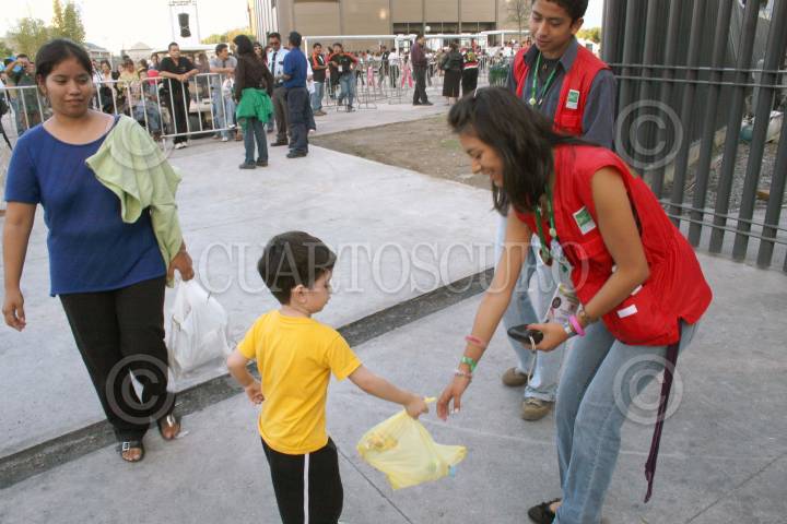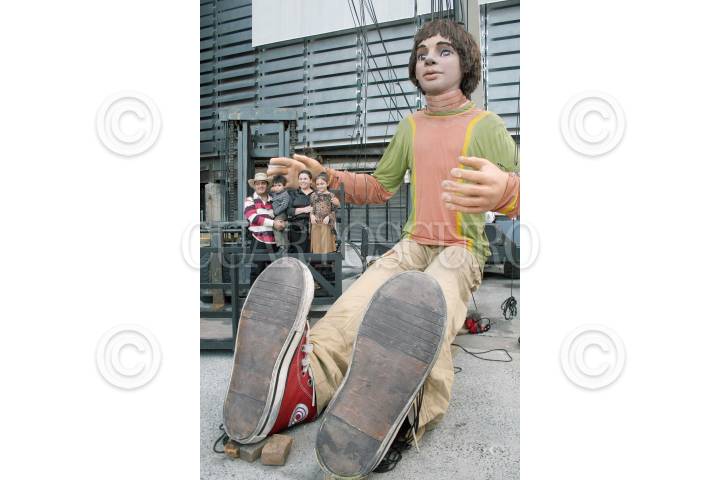 MONTERREY, NUEVO LEON 04NOVIEMBRE2007.- Se abrio un centro de acopio en la parte del horno 3, con "Luca" la marioneta gigante que forma parte del show emblematico del forum universal de las culturas,donde la gente podra tomarse la foto con el personaje a cambio de llevar víveres, la meta es llenar un vagon de tren. FOTO: PEDRO KRISTIAN LOPEZ/CUARTOSCURO.COM
