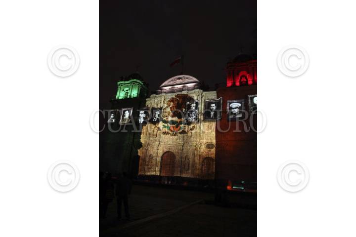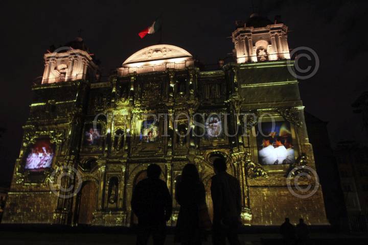 OAXACA, OAXACA, 15SEPTIEMBRE2011.- La madrugada de este 15 de septiembre, previo al grito de Dolores, trabajadores de una empresa privada contratada por el gobierno del estado, realizan una serie de pruebas del espectáculo de luces, mismo que reflejará en la fachada de la Catedral de la ciudad de Oaxaca un video conmemorativo. FOTO: ARTURO PÉREZ ALFONSO/CUARTOSCURO.COM