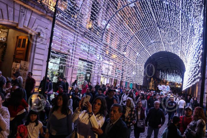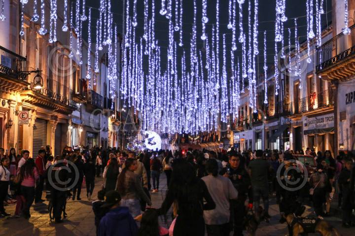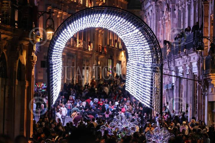 ZACATECAS, ZACATECAS, 30NOVIEMBRE2024.- Fui inaugurada el Festival de las Luces en las principales calles del centro histórico. Los adornos navideños en los diferentes callejones y plazas serán acompañados de más de 60 actividades que Gobierno del Estado realizará como parte fiestas de cembrinas. FOTO: ADOLFO VLADIMIR /CUARTOSCURO.COM