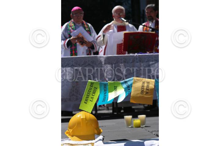 MÉXICO, D.F., 19FEBRERO2010.- El obispo Samuel Ruíz, encabezó una misa en la que se pidió por el descanso de los trabajadores muertos en la mina de carbón Pasta de Conchos hace cuatro años. A la ceremonia asistieron familiares, amigos y simpatizantes, que exigieron el rescate de los cuerpos, el pago de las indemnizaciones a sus familiares y el castigo a los culpables, en este caso a los dueños del Grupo México. FOTO: MOISÉS PABLO/CUARTOSCURO.COM