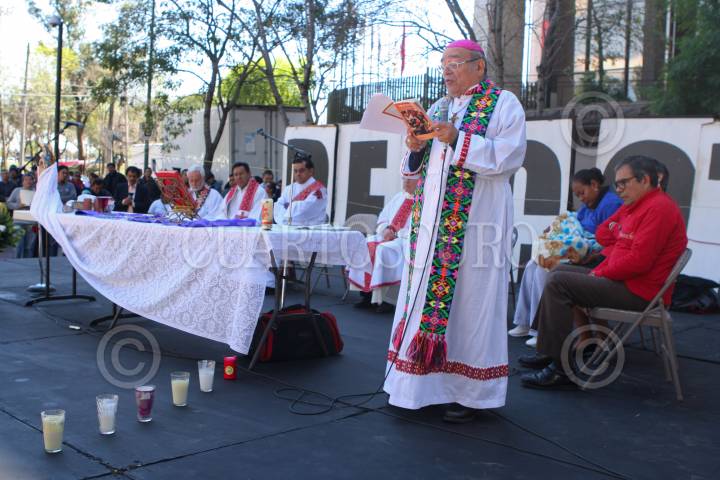 MÉXICO, D.F., 19FEBRERO2010.- El obispo Raúl Vera, encabezó la misa en memoria de los 65 mineros que perecieron en la mina de Pasta de Conchos, tras colapsarse hace cuatro años, esta se celebró en frente de las instalaciones del Grupo México en Polanco. El religioso exigió el castigo a los culpables, el rescate de los cuerpos de los 63 que aún permanecen sepultados en el socavón y el pago de las indemnizaciones correspondientes a sus familiares. FOTO: MOISÉS PABLO/CUARTOSCURO.COM