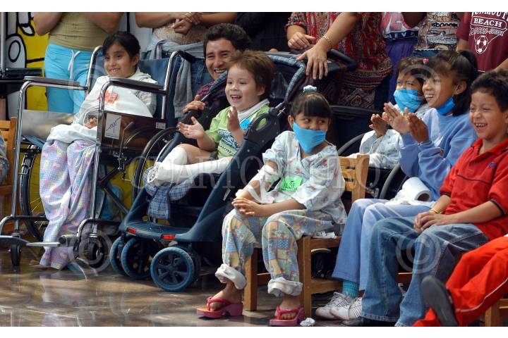 MEXICO D.F. 09MAYO2006.- Se presento un espectáculo de focas en la recepción del Hospital Infantil de México Federico Gómez para divertir a los pacientes internados. Varios pacientes en sillas de ruedas observan a las focas durante su actuación. FOTO: Germán Romero/CUARTOSCURO.COM