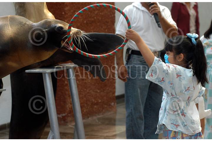 MEXICO D.F. 09MAYO2006.- Se presento un espectáculo de focas en la recepción del Hospital Infantil de México Federico Gómez para divertir a los pacientes internados. Una niña juega con una foca durante su actuación. FOTO: Germán Romero/CUARTOSCURO.COM