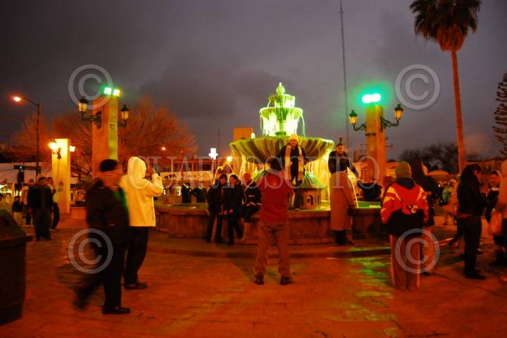 NUEVO LAREDO, TAMAULIPAS, 04ENERO2011.- Las bajas temperaturas de hasta menos seis grados que se dejaron sentir en la región convirtieron a las fuentes congeladas en un atractivo para la población en general que acudió hasta estos lugares para tomarse fotografías del recuerdo durante las últimas horas en tanto que se espera que el clima mejore en las próximas 24 horas. FOTO: JOAQUIN MURRIETA/CUARTOSCURO.COM