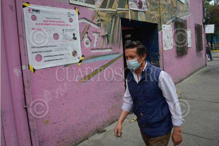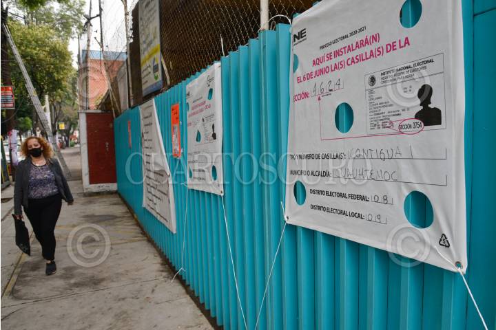 Pancartas del Instituto Nacional Electoral (INE) señalan el lugar donde será instalada una casilla para votar en las próximas elecciones del 6 de junio.