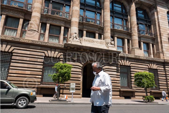 Un hombre pasa con un cubreboca por el edificio del Banco de México