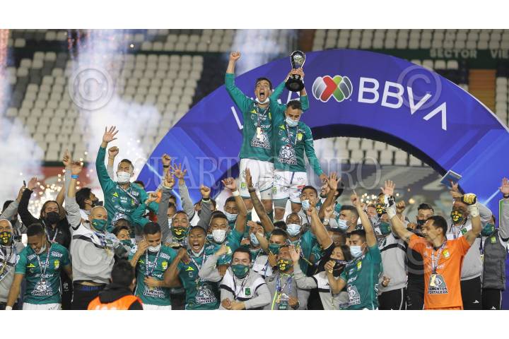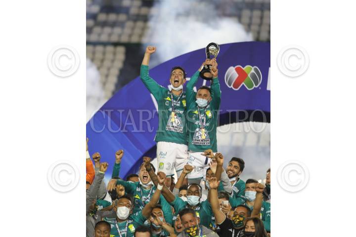 El León alzó el trofeo como ganador del torneo Guard1anes de la Liga MX, con este logró llegaron a ocho títulos en su historial. En la imagen Ignacio González y Luis Montes alzaron la copa.