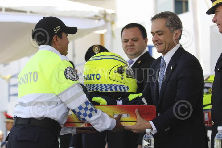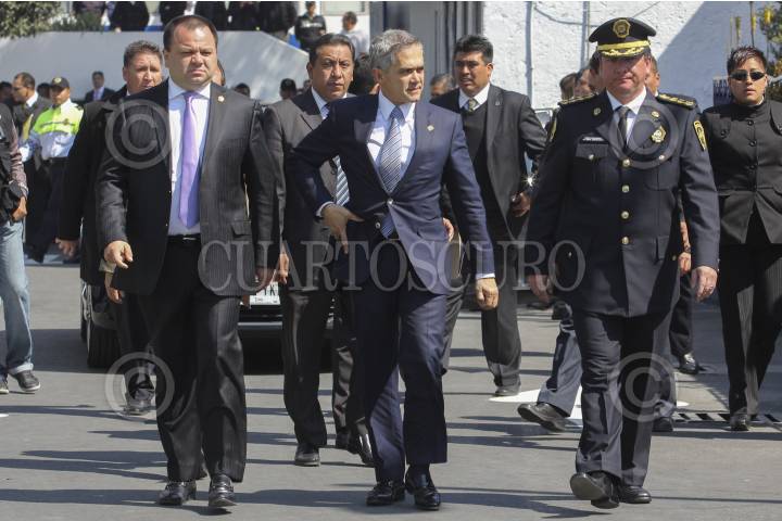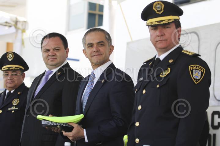 MÉXICO, DF., 03MARZO2013.- Miguel Ángel Mancera, jefe de gobierno del Distrito Federal, acompañado del Secretario de Seguridad Pública del Distrito Federal, Jesús Rodriguez Almeida, Gabriel Carreón Garrido, director de transito y Luis Rosales Gamboa, superintendente de la SSP-DF, acudieron a la entrega de grados a seis nuevos directores de la Policía de Tránsito y anunció la modernización de los semáforos, monitoreo de velocidades y la aplicación de infracciones como parte de su programa para mejorar la movilidad en la Ciudad de México. FOTO: SAÚL LÓPEZ /CURTOSCURO.COM