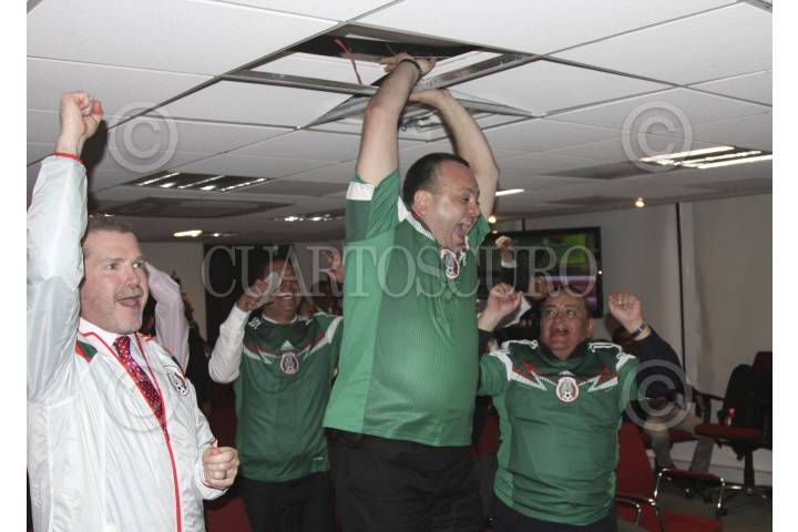 MÉXICO, D.F., 23JUNIO2014.- Tras un efusivo festejo del segundo gol de la selección mexicana, el Secretario de Seguridad Pública del Distrito Federal, Jesús Rodríguez Almeida, rompió un plafon de las instalaciones de la sala de reuniones de la SSP-DF., durante la proyección del partido de México ante Croacia. FOTO: SAÚL LÓPEZ /CUARTOSCURO.COM