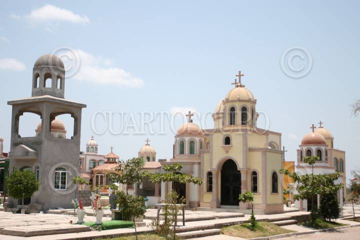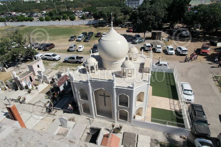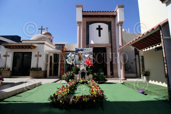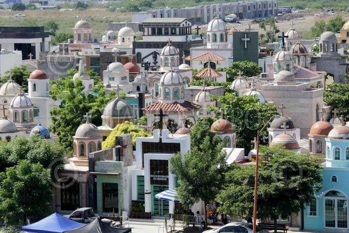 CULIACAN, SINALOA,. 02JUNIO2008.- Algunos panteones en Sinaloa cuentan con grandes lujos. Las tumbas son, amplias, ostentosas, elaboradas de cantera, marmol y con acabados finos, parecidos a las iglesias de las diferentes localidades, dichos cementerios alcanzan precios equivalentes a una casa habitacion en zonas urbanas. Las cervezas, botellas de licor, fotos, sombreros, cigarros, mantas, santos, medallas y rosarios de oro, decoran las criptas. El la imagen el panteón Jardines del Humaya en Culiacan. FOTO: SAUL LOPEZ/CUARTOSCURO.COM