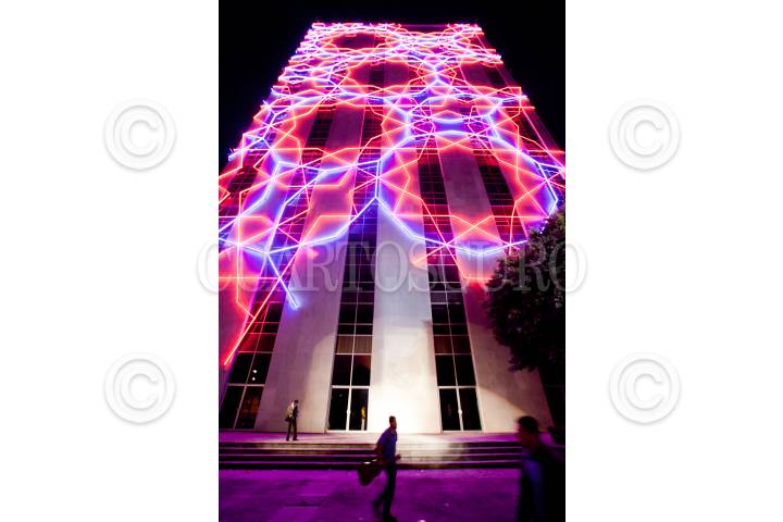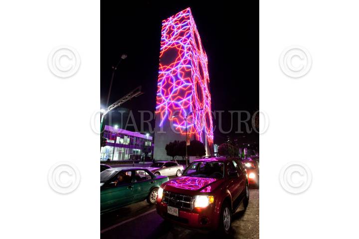 MÉXICO, D.F., 23NOVIEMBRE2010.- Se inauguró esta noche la instalación lumínica El Faro-Xipe Tótec, el artista Thomas Glassford, en la torre del Centro Cultural Universitario Tlatelolco CCUT- UNAM. FOTO: ISAAC ESQUIVEL/CUARTOSCURO.COM
