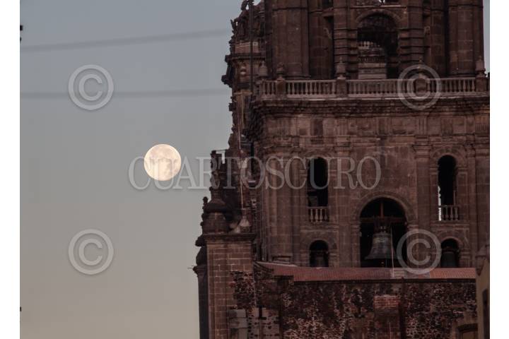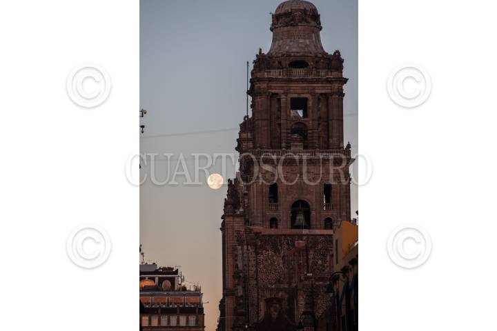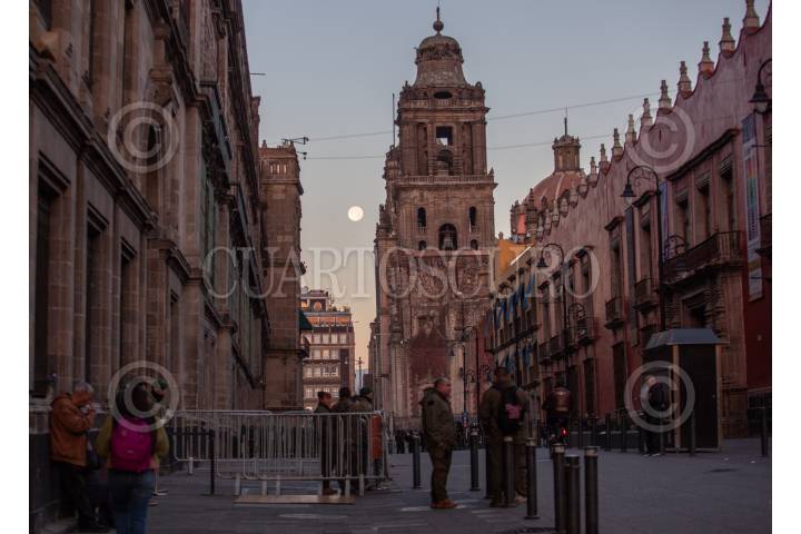 CIUDAD DE MÉXICO, 13FEBRERO2024.- Aspecto de la Luna llena al amanecer vista desde el primer cuadrante del centro histórico de la Ciudad. FOTO: ANDREA MURCIA /CUARTOSCURO.COM