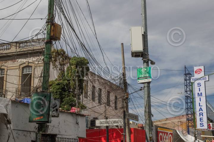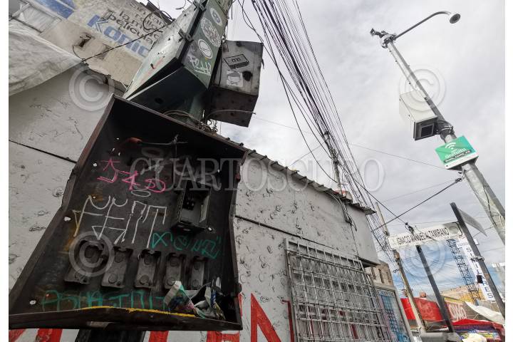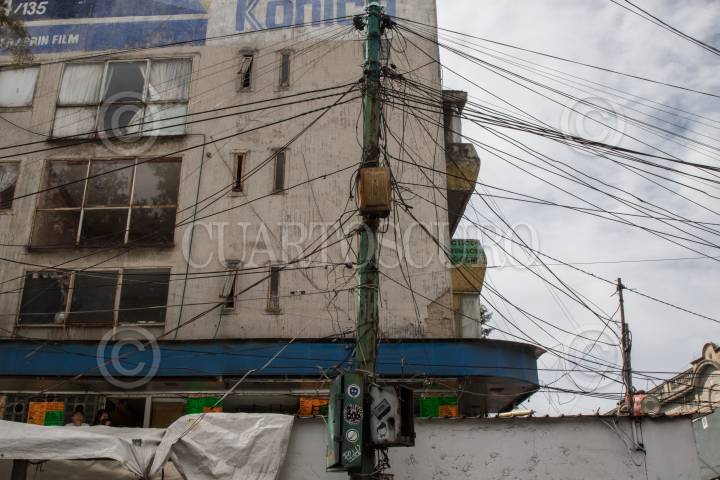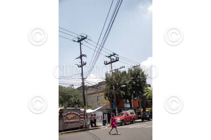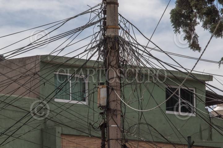 Cientos de cables (diablitos) se observan colgados de los postes de luz eléctrica, los cuales proveen de energía a los puestos informales de la avenida Santa María La Ribera.