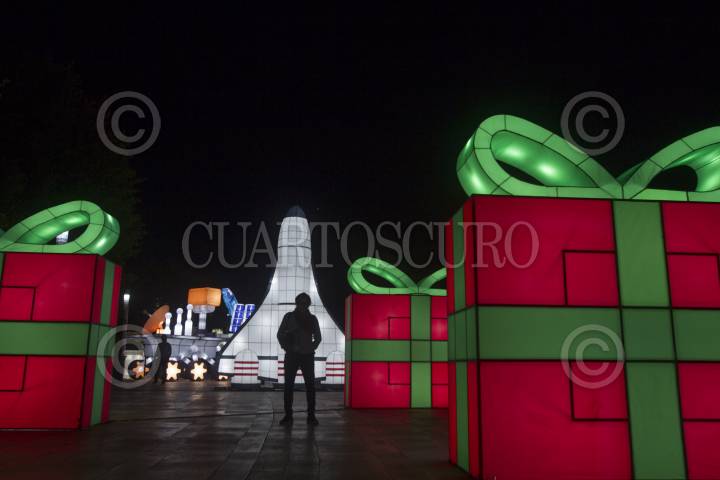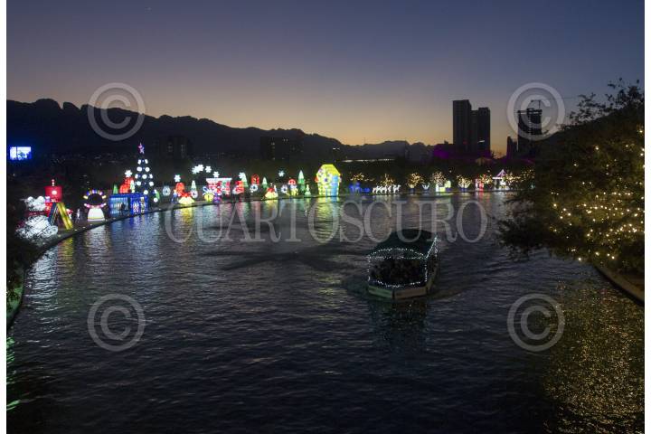 MONTERREY, NUEVO LEÓN, 01DICIEMBRE2017.- Se llevó a cabo el encendido de "Luztopía", más de 200 estructuras iluminadas con motivos navideños sobre el Paseo Santa Lucía con tres kilómetros de recorrido; una de las más grandes de América Latina. Las figuras fueron diseñadas por mexicanos y estará exhibida hasta el 6 de enero. FOTO: GABRIELA PÉREZ MONTIEL /CUARTOSCURO.COM