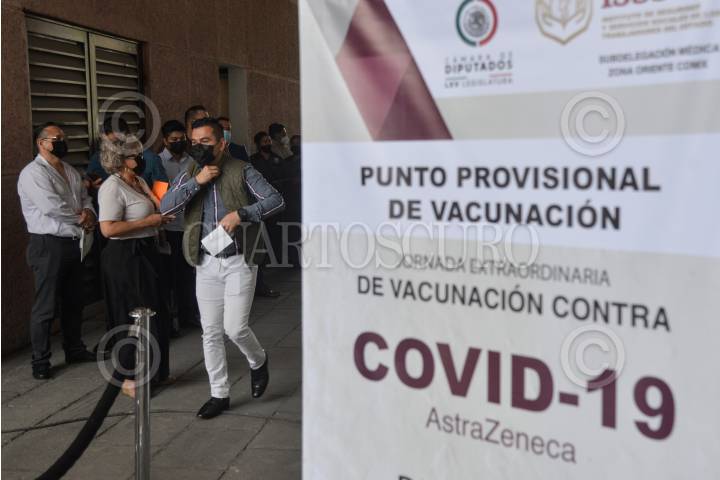 Trabajadores de la Cámara de Diputados acudieron a los módulos de vacunación contra Covid-19 instalado en la explanada del recinto legislativo de San Lázaro.