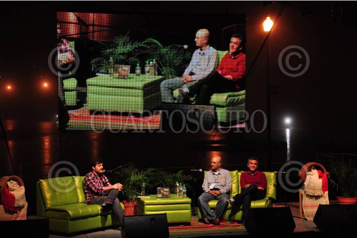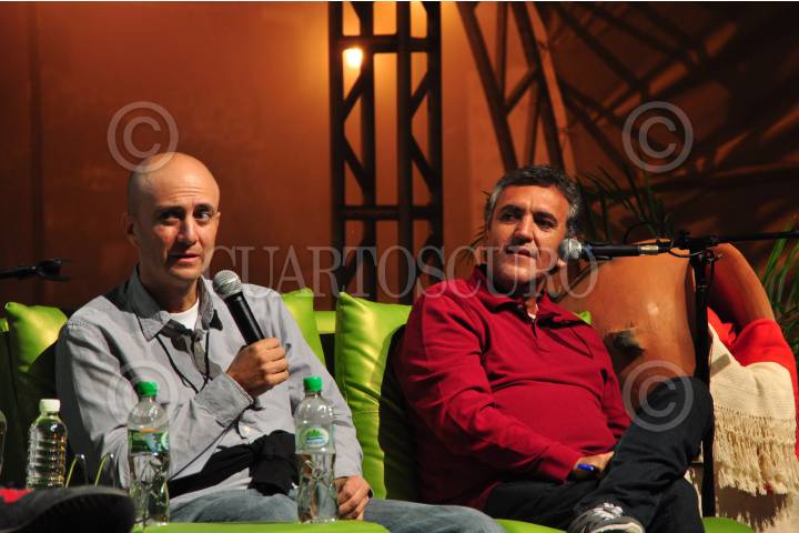 XALAPA, VER., 06OCTUBRE2012.- Dentro del Hay Festival 2012 se presentaron los moneros mexicanos Jis y Trino para hablar sobre su trabajo y presentar el primer trailer de la película animada 'El Santos contra la Tetona Mendoza', basada en el personaje de las tiras cómicas de estos autores, el evento se llevó cabo en la Casa del Lago de esta capital. FOTO: JAN VÁZQUEZ /CUARTOSCURO.COM