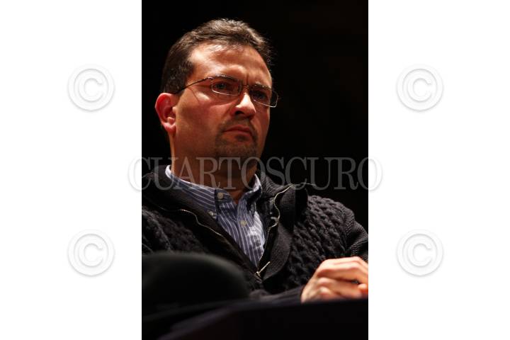 El caricaturista Rafael Barajas "El Fisgón", durante la inauguración de la exposición de Manuel Ahumada, en la Casa del Refugiado Citlaltepetl.
