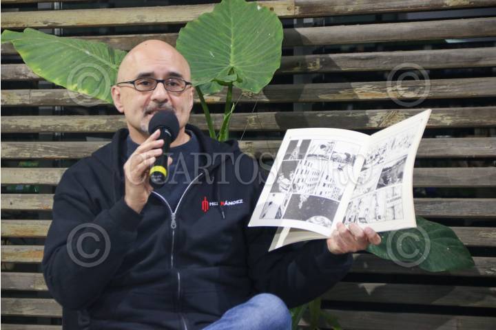 El caricaturista José Hernández, durante la inauguración de la exposición de Manuel Ahumada, en la Casa del Refugiado Citlaltepetl.
