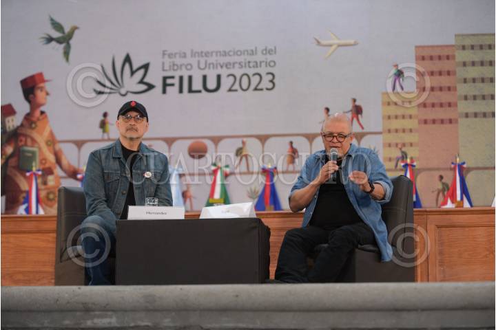 Los caricaturistas José Hernández y Rafael Pineda presentaron la conferencia “El oficio del Monero” en la FILU2023. Aprovecharon la conferencia para parodiar dos “serenatas”, una dedicada por los conservadores a López Obrador y otra, de Felipe Calderón a Genaro a García Luna.