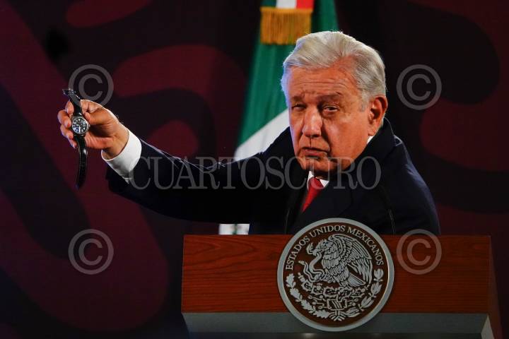 CIUDAD DE MÉXICO, 05SEPTIEMBRE2024.- Andrés Manuel López Obrador, presidente de México, durante la conferencia matutina, mostrando su reloj para desmentir publicaciones de redes sociales sobre la marca y costo, esto desde el Salón Tesorería de Palacio Nacional. FOTO: ROGELIO MORALES /CUARTOSCURO.COM