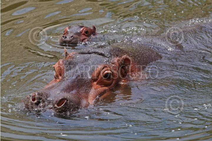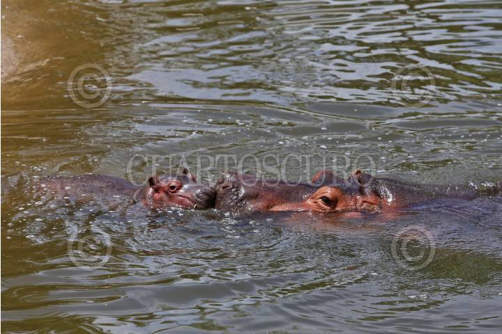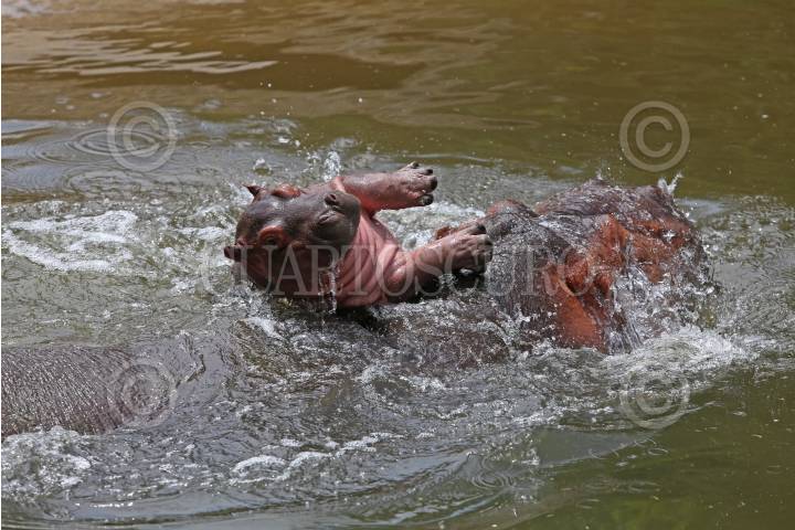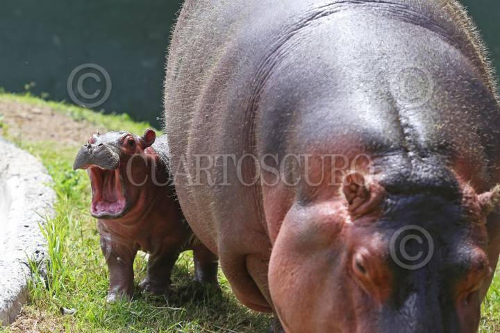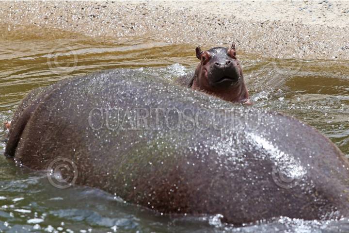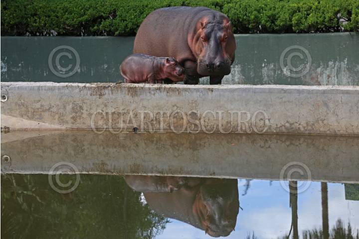 Reflejo de Hipopótamo de Río Bebe y su madre durante su estancia en el Zoológico de Guadalajara, donde se encuentras en cautiverio.