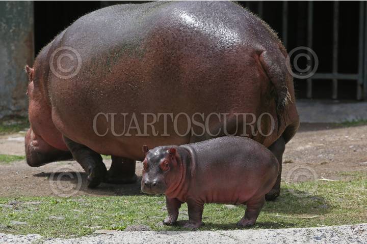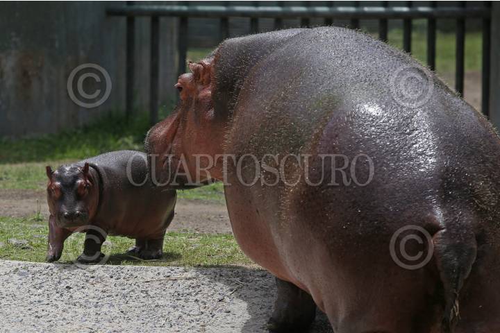 Hipopótamo de Río Bebe camina en las inmediaciones de en un estanque del Zoológico de Guadalajara, donde se encuentra en cautiverio acompañado de su madre.