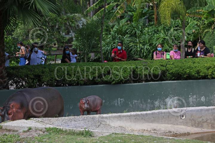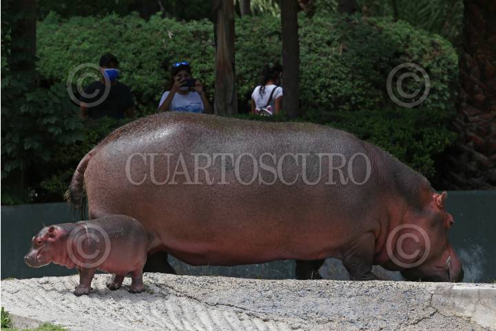 Visitantes al Zoo, fotografían al Hipopótamo de Río Bebe, que camina en las inmediaciones de en un estanque del Zoológico de Guadalajara, donde se encuentra en cautiverio acompañado de su madre.