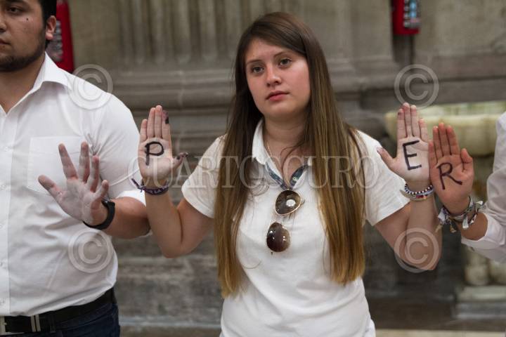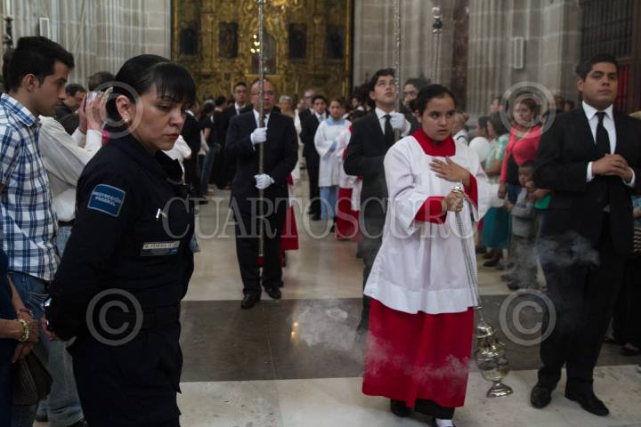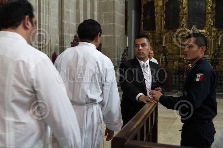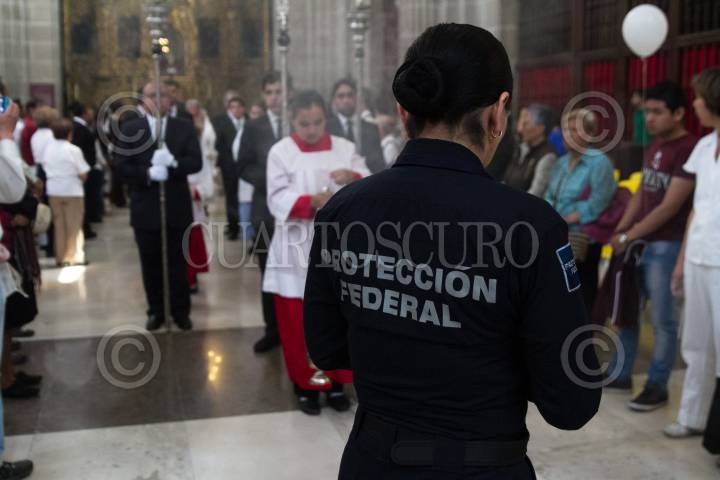 CIUDAD DE MÉXICO, 21MAYO2017.- Bajo el resguardo de la seguridad de la Catedral Metropolitana reforzado con elementos de la Policía Federal se realizó la misa del medio día encabezada por el Cardenal Norberto Rivera Carrera, quien señalo que la Iglesia perdona al agresor del padre José Miguel Machorro, pero que también pide justicia a las autoridades correspondientes. FOTO: MOISÉS PABLO /CUARTOSCURO.COM