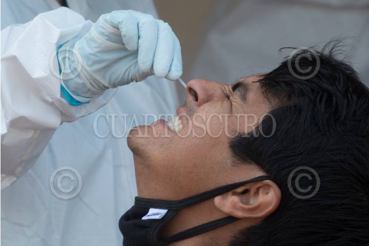 Personas asisten a realizarse la prueba rápida de detección de Covid-19 en el "macro kiosko" reinstalado al exterior de la alcaldía Venustiano Carranza. .