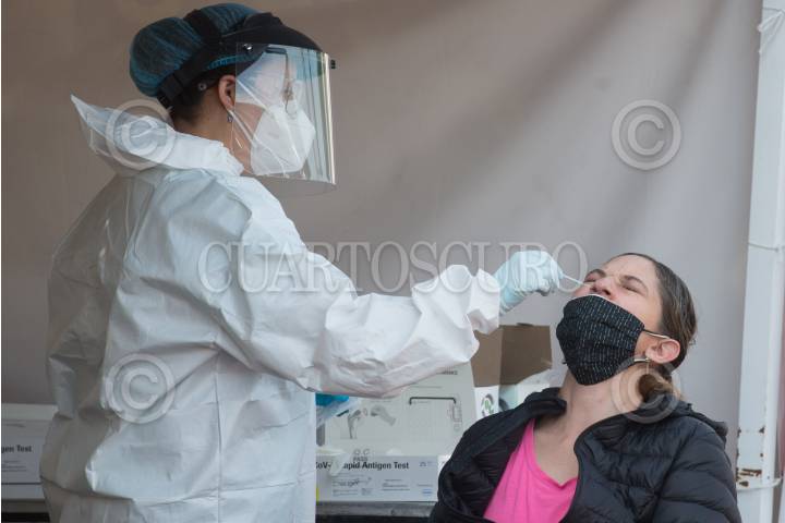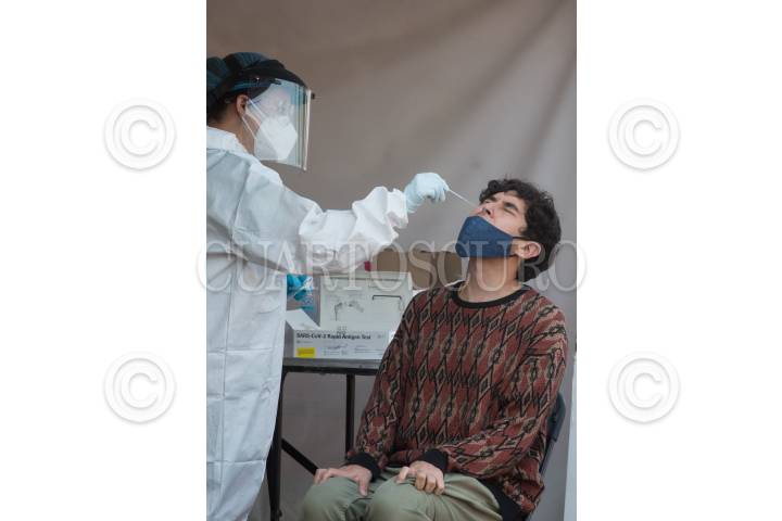 Personas asisten a realizarse la prueba rápida de detección de Covid-19 en el "macro kiosko" reinstalado al exterior de la alcaldía Venustiano Carranza.