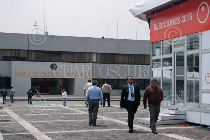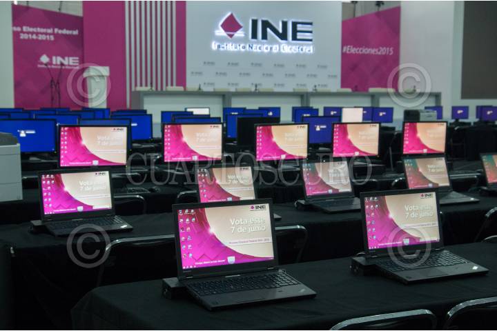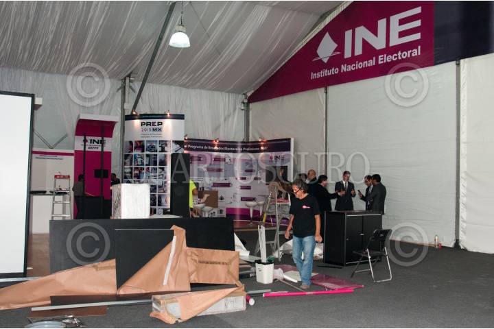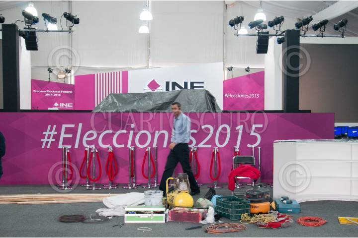 MÉXICO, D.F., 01JUNIO2015.- A menos de una semana para los comicios electorales, trabajadores afinan los ultimos detalles de la macro sala de prensa que fue montada en el Instituto Nacional Electoral (INE) para que décenas de medios nacionales den cobertura a las elecciones del próximo 7 de junio. FOTO: DIEGO SIMÓN SÁNCHEZ /CUARTOSCURO.COM