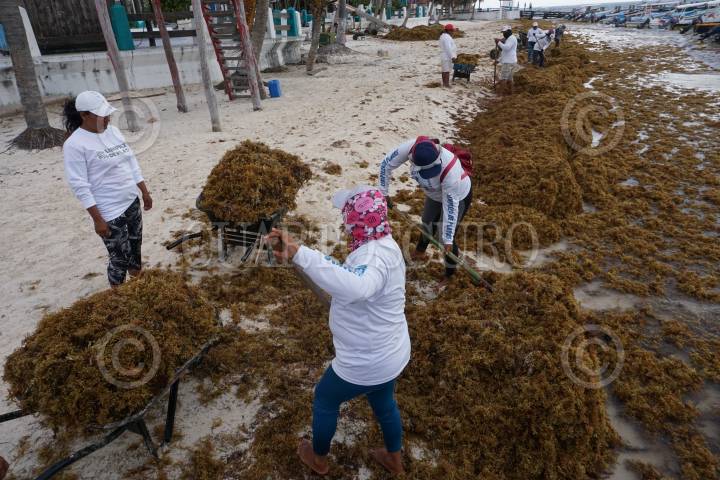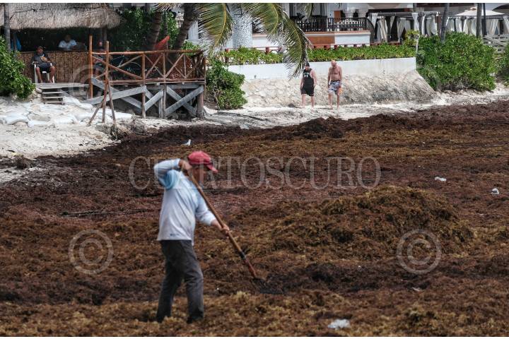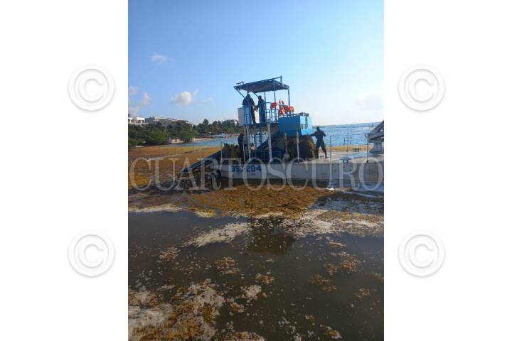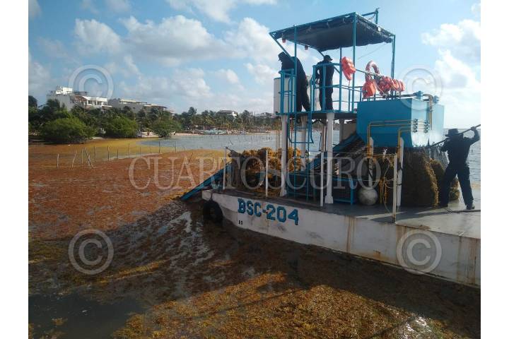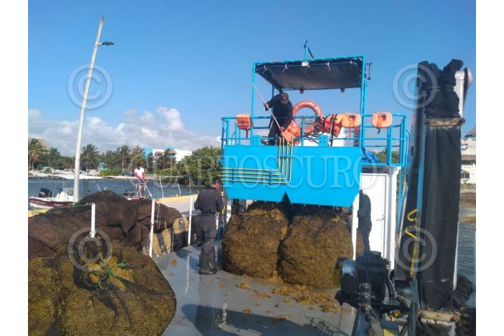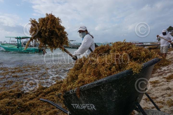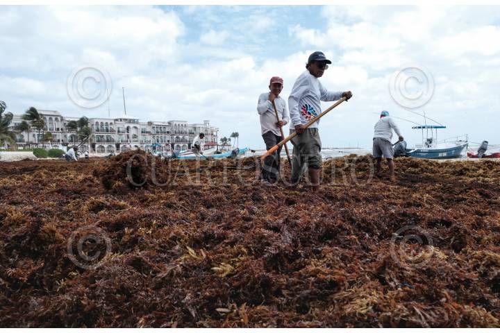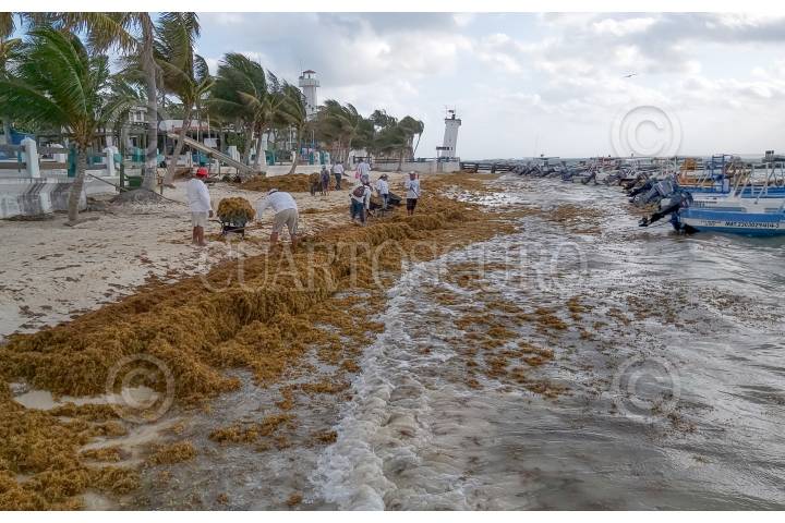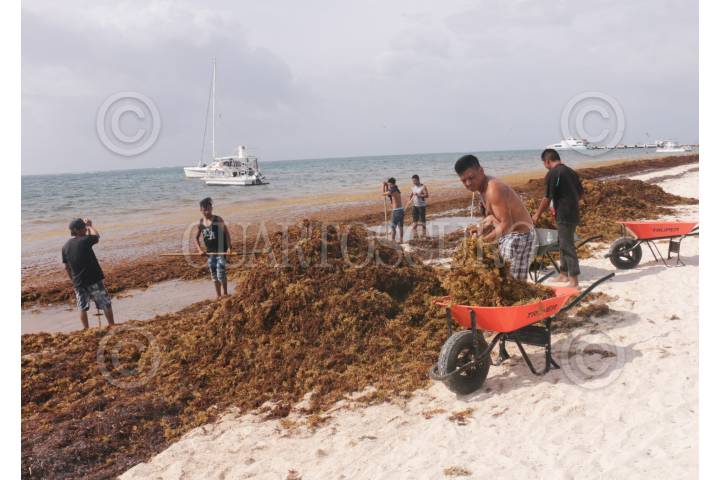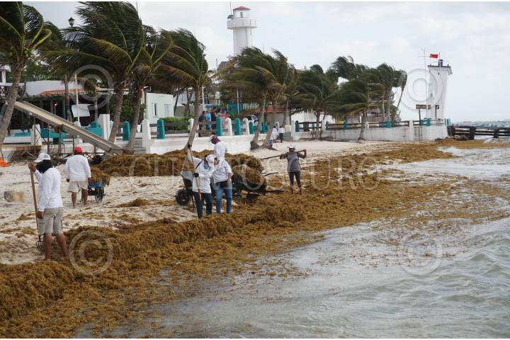 Trabajadores del ayuntamiento de Puerto Morelos han iniciado labores de limpieza del sargazo que ha llegado en gran volumen a esta zona.