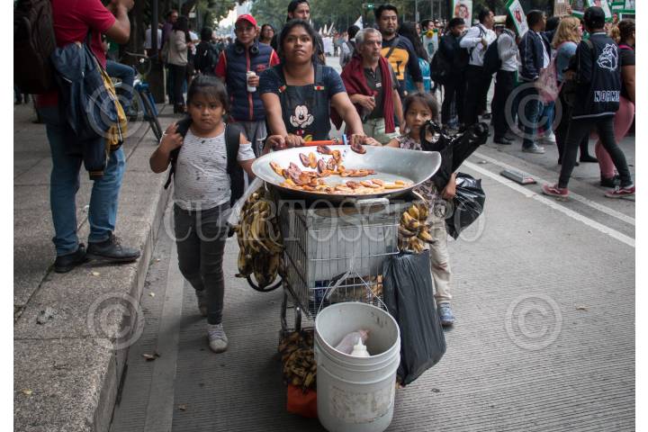 CIUDAD DE MÉXICO, 26SEPTIEMBRE2019.- Previo a manifestación en Av. Refoma mujer de origen indigena acompaña de sus dos hijas venden platanos machos en un carrito de mandado a los transeúntes. FOTO: ANDREA MURCIA /CUARTOSCURO.COM