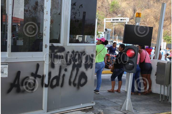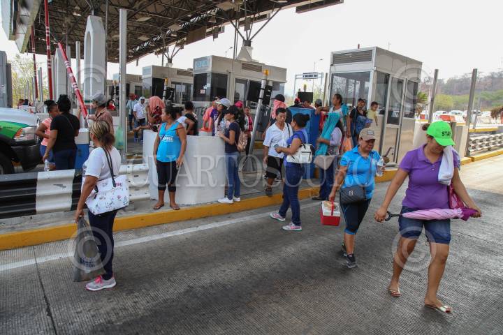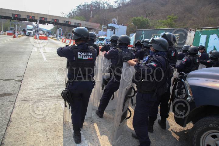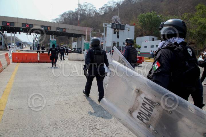 ACAPULCO, GUERRERO, 24MAYO2019.- Madres de familia de la zona Escolar 44 de Acapulco tomaron la caseta de La Venta de la Autopista del Sol, para manifestarse y exigir a las autoridades de la Secretaria de la Educación de Guerrero maestros que hacen falta en ocho escuelas de esa zona. Durante la toma de la caseta pidieron una cooperación de 50 pesos a los automovilistas para poder pagar a maestros interinos. Alrededor de 30 policías antimotines estatales llegaron para tratar de disuadir la protesta, por lo que las madres de familia optaron por retirarse del lugar. FOTO: CARLOS ALBERTO CARBAJAL /CUARTOSCURO.COM