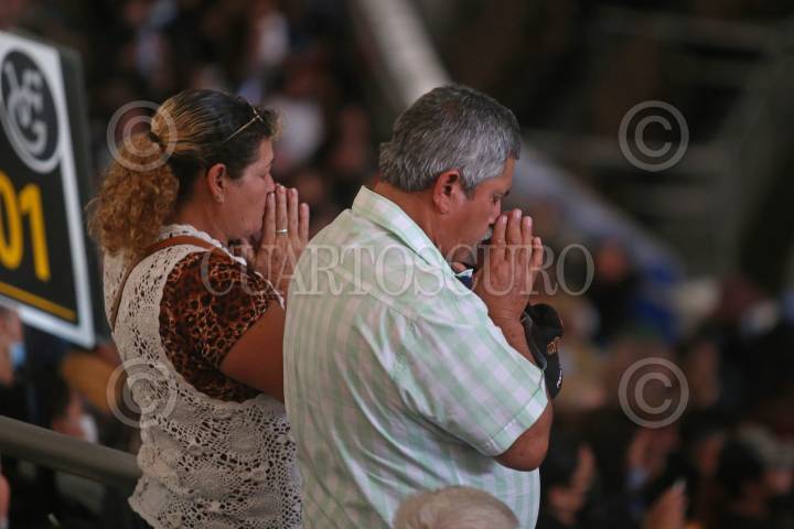Admiradores de “El Charro de Huentitán” rezan durante la misa de cuerpo presente de Don Vicente Fernández Gómez, acompañada por algunos mariachis, esta tarde en la Arena VFG.