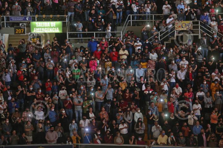 Admiradores de “El Charro de Huentitán” toman fotografías y video durante la misa de cuerpo presente de Don Vicente Fernández Gómez, acompañada por algunos mariachis, esta tarde en la Arena VFG.