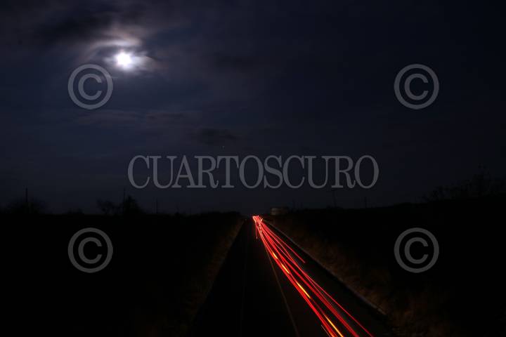 Paisaje de la luna llena y la luz de los autos que circulan por la autopista Siglo XXI, fotografía de larga exposición tomada la madrugada de ayer cerca del poblado de San Mateo Coatepec, en Puebla.