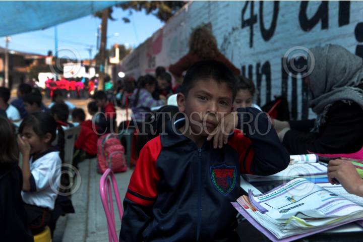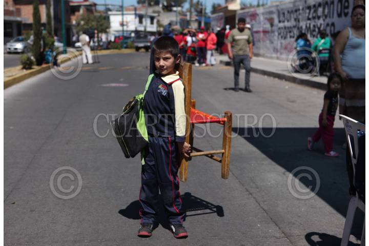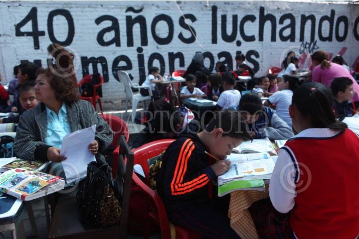 MORELIA, MICHOACÁN, 09FEBRERO2015.- Alumnos de diferentes grados de la Escuela Primaria Primero de Mayo, de la colonia Tierra y Libertad, toman clase afuera del plantel educativo, por un conflicto generado entre el Movimiento Antorchista y la facción democrática de la SNTE. Unos 100 hombres antorchistas mantienen el control de la escuela desde comienzos de año y se niegan a que la directora nombrada tomé posesión del plantel educativo, los civiles se mantienen dentro de las instalaciones y en alerta por un posible ataque de maestros. FOTO: ALAN ORTEGA /CUARTOSCURO.COM