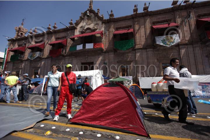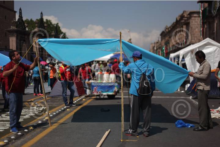 MORELIA, MICHOACÁN, 10SEPTIEMBRE2015.- Maestros de la Coordinadora Nacional de Trabajadores de la Educación (CNTE) iniciaron un plantón por tiempo indefinido en el Centro Histórico de Morelia, en demanda del pago de bonos que suman 726 millones de pesos. Sobre la vía pública, los maestros levantaron casas de campaña y lonas para pernoctar, el plantón abarca la Avenida Madero, frente al Palacio de Gobierno y la Catedral, en la principal zona turística de la capital michoacana. FOTO: ALAN ORTEGA /CUARTOSCURO.COM